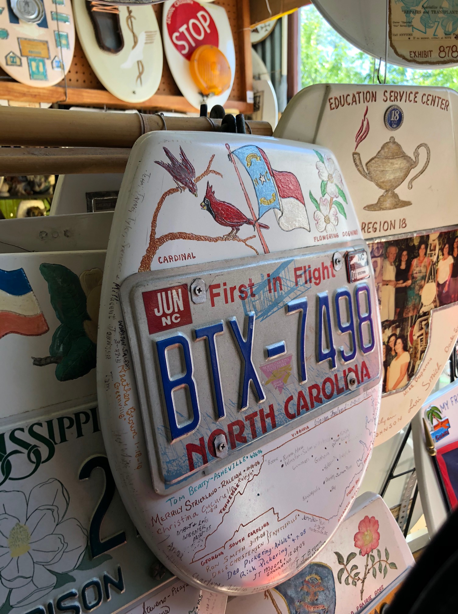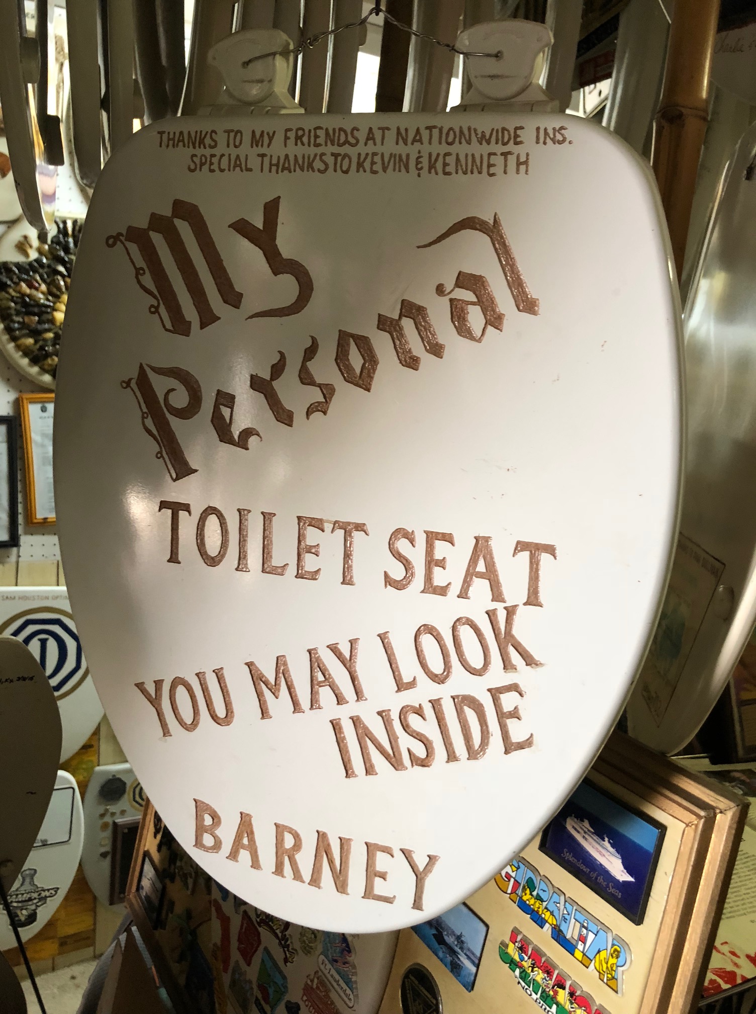 The toilet seats tell Barney Smith’s personal history, with one toilet seat even labeled as his personal toilet seat. Lift the lid and it traces his careers as a fireman, a plumber, and an artist. There are also several toilet seats commemorating his wedding anniversaries, his life with his wife, and his relationships with his children. Some seats tell the history of his art and its reach, with toilet seats for all of the states and countries his visitors have come from.